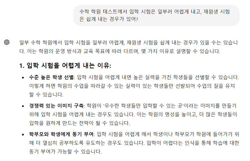 입학 테스트를 어렵게 내서 학생 성적이 잘 나오지 않으면, 지금 배우고 있는 학원에서 잘못 배우고 있다고 지금 다니고 있는 학원을 깔수가 있다.
