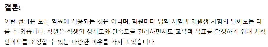 재원생 테스트는 쉽게 내어서 지금 학생이 잘 하고 있다고, 만족감을 심어주어 퇴원율을 감소시킬수 있다.